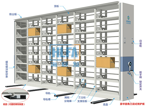 密集架按結(jié)構(gòu)分類有兩種形式,半封閉式密集架和全封閉式密集架,海發(fā)HF-MJFB051號(hào)密集架就是全封閉式密集架。全封閉式密集架主體由立柱、層板、頂板、底板、節(jié)間側(cè)板、節(jié)與節(jié)之前的封板和最外側(cè)護(hù)板、列門板等組成,比半封閉式密集架多了私密性,因此主要用于存放私密性較強(qiáng)或較小物品的存儲(chǔ)。